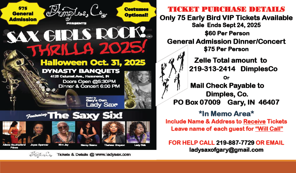 Born into a family tree of well-versed musicians, Ernie Delores (Caldwell) Shelby is a talented saxophonist, vocalist and composer. In elementary school, when the music department ran out of “girlie” instruments such as flutes and clarinets When given the choice between tuba or saxophone. At the tender age of 14, a heckler in the audience named her “Lady Sax”®. And while Lady Sax®. is definitely musically blessed and anointed, she is also a business-woman; owning the music company Dimples,Company and EDSAS (Ernie D. Shelby Accounting Services). In 2007, she founded the non profit organization, “Sisters in Song”. In the 2010, “Sheation 1-2:22 It’s Not All Eve’s Fault”; a gospel musical that she wrote, directed and produced; premiered in Chicago, IL. Her motto comes from the Holy Bible, Psalms 92:10.